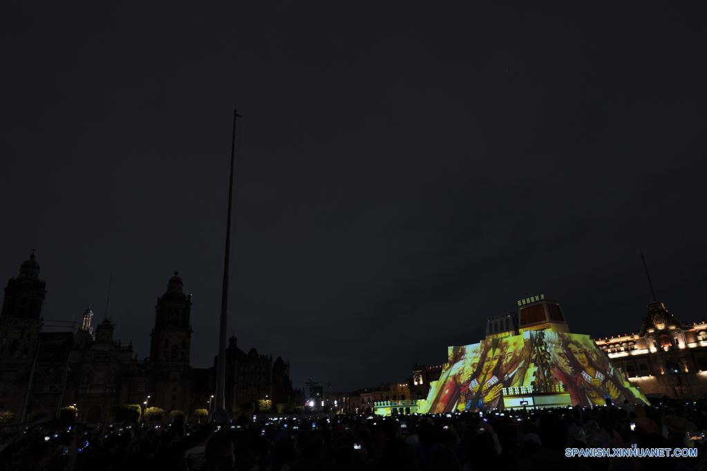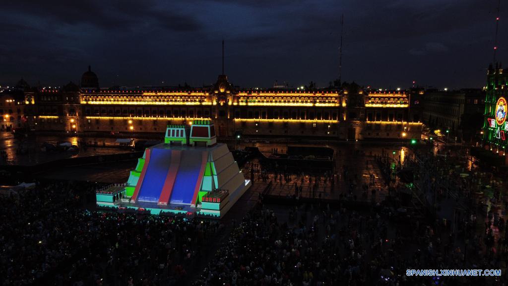 CIUDAD DE MEXICO, 13 agosto, 2021 (Xinhua) -- Imagen del 13 de agosto de 2021 de la maqueta monumental del Huey Teocalli durante el espectáculo "Memoria Luminosa" en el marco de los 500 años de la Resistencia Indígena México-Tenochtitlán, en el Centro Histórico de la Ciudad de México, capital de México. (Xinhua/David de la Paz)