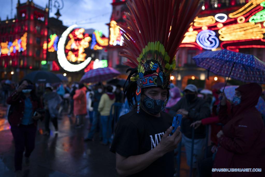CIUDAD DE MEXICO, 13 agosto, 2021 (Xinhua) -- Un danzante revisa su teléfono móvil durante una celebración en el marco de los 500 años de la Resistencia Indígena México-Tenochtitlán, en el Centro Histórico de la Ciudad de México, capital de México, el 13 de agosto de 2021. (Xinhua/David de la Paz)