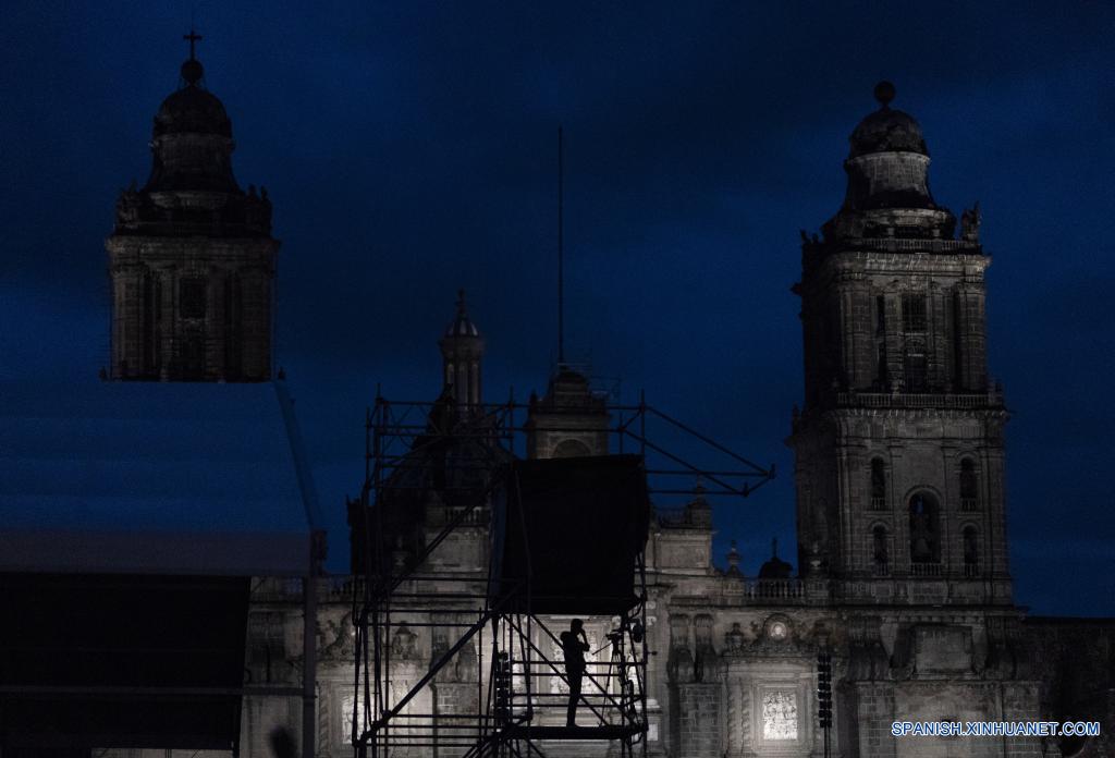 CIUDAD DE MEXICO, 13 agosto, 2021 (Xinhua) -- Una persona trabaja frente a la Catedral Metropolitana durante el espectáculo "Memoria Luminosa" en el marco de los 500 años de la Resistencia Indígena México-Tenochtitlán, en el Centro Histórico de la Ciudad de México, capital de México, el 13 de agosto de 2021. (Xinhua/David de la Paz)