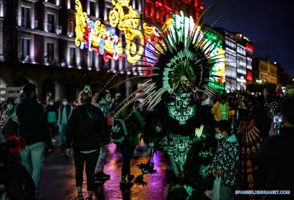 CIUDAD DE MEXICO, 13 agosto, 2021 (Xinhua) -- Un danzante y un niño visitan la iluminación conmemorativa por los 500 años de la Resistencia Indígena México-Tenochtitlán, en el Centro Histórico de la Ciudad de México, capital de México, el 13 de agosto de 2021. (Xinhua/Sunny Quintero)