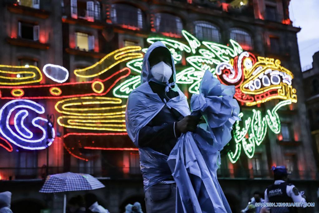 CIUDAD DE MEXICO, 13 agosto, 2021 (Xinhua) -- Un hombre vende impermeables frente a la iluminación conmemorativa por los 500 años de la Resistencia Indígena México-Tenochtitlán, en el Centro Histórico de la Ciudad de México, capital de México, el 13 de agosto de 2021. (Xinhua/Quetzalli Blanco)