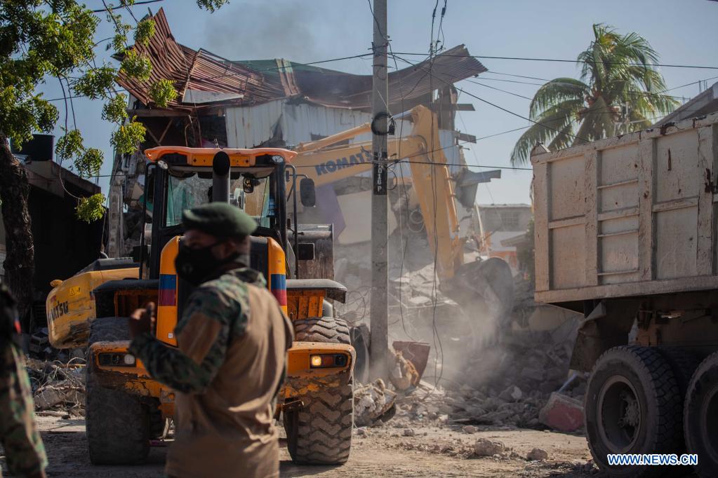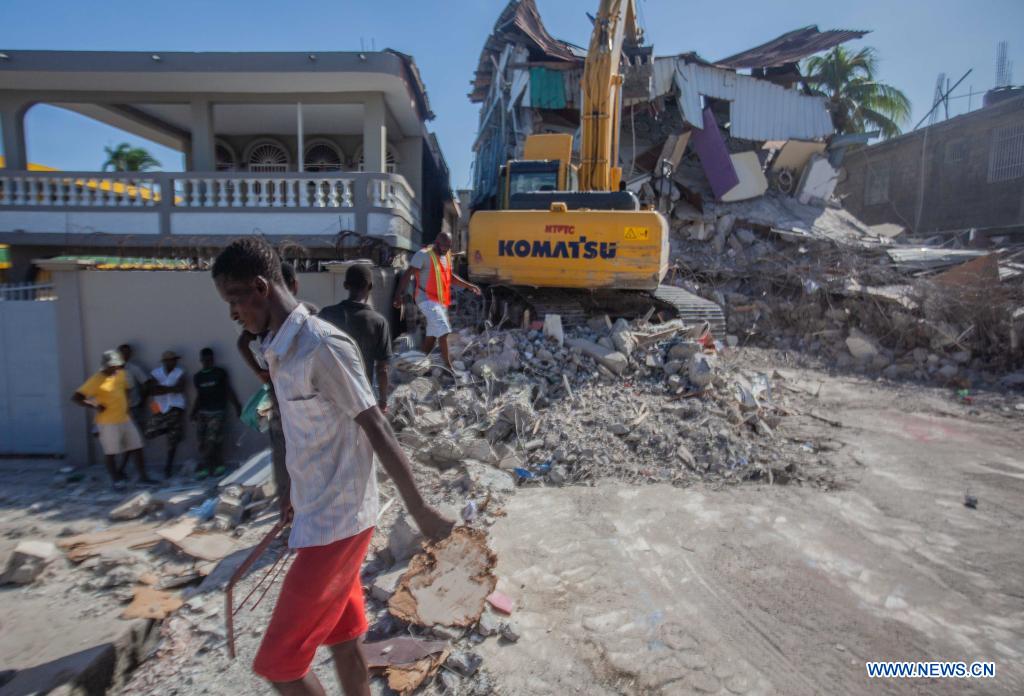 Imagen del 15 de agosto de 2021 de una excavadora removiendo escombros frente a un edificio dañado después de un terremoto, en Les Cayes, Haití. Aumentó a 1.297 el número de muertos por el terremoto de magnitud 7,2 ocurrido el sábado en Haití, informó el domingo el coordinador de Protección Civil haitiano, Jerry Chandler. (Xinhua/Richard Pierrin)