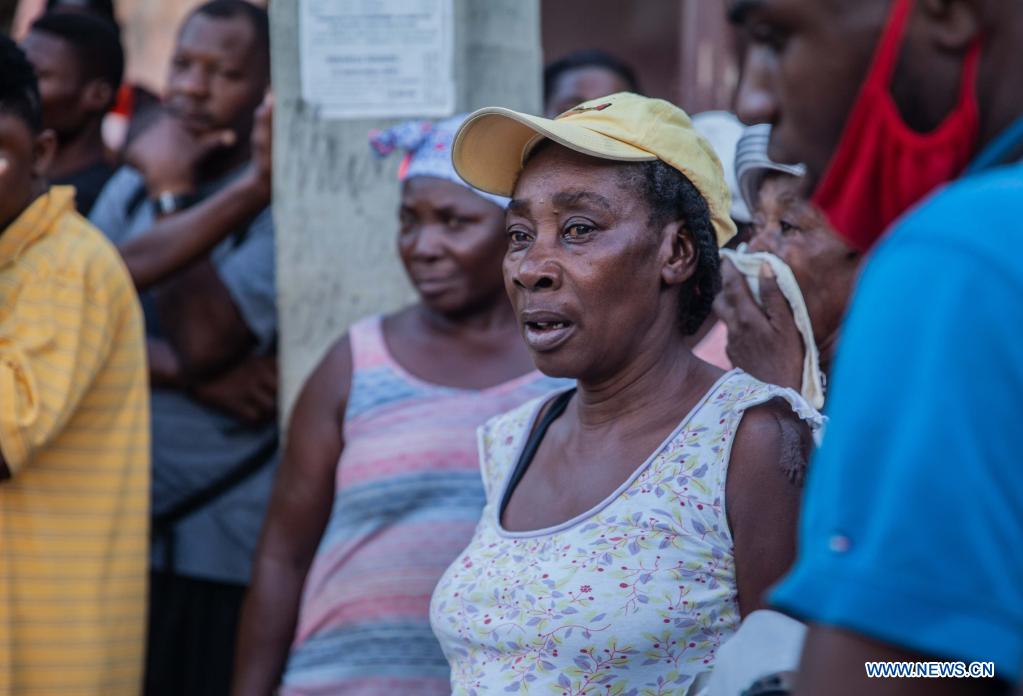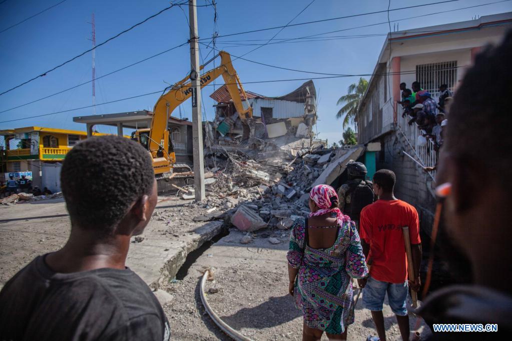 Imagen del 15 de agosto de 2021 de personas observando un edificio dañado después de un terremoto, en Les Cayes, Haití. Aumentó a 1.297 el número de muertos por el terremoto de magnitud 7,2 ocurrido el sábado en Haití, informó el domingo el coordinador de Protección Civil haitiano, Jerry Chandler. (Xinhua/Richard Pierrin)