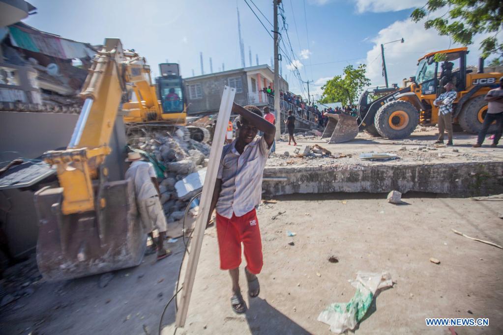 Imagen del 15 de agosto de 2021 de un hombre removiendo escombros de un edificio dañado después de un terremoto, en Les Cayes, Haití. Aumentó a 1.297 el número de muertos por el terremoto de magnitud 7,2 ocurrido el sábado en Haití, informó el domingo el coordinador de Protección Civil haitiano, Jerry Chandler. (Xinhua/Richard Pierrin)