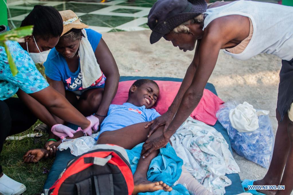 Imagen del 15 de agosto de 2021 de un niño recibiendo tratamiento médico después de un terremoto, en Les Cayes, Haití. Aumentó a 1.297 el número de muertos por el terremoto de magnitud 7,2 ocurrido el sábado en Haití, informó el domingo el coordinador de Protección Civil haitiano, Jerry Chandler. (Xinhua/Richard Pierrin)