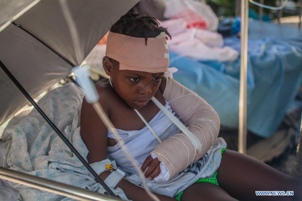 Imagen del 15 de agosto de 2021 de un niño descansando luego de recibir tratamiento médico después de un terremoto, en Les Cayes, Haití. Aumentó a 1.297 el número de muertos por el terremoto de magnitud 7,2 ocurrido el sábado en Haití, informó el domingo el coordinador de Protección Civil haitiano, Jerry Chandler. (Xinhua/Richard Pierrin)