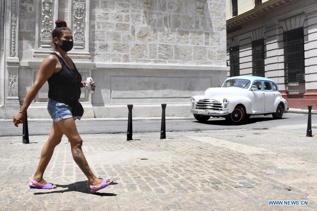 LA HABANA, 21 agosto, 2021 (Xinhua) -- Una mujer camina frente a un automóvil antiguo en una calle, en La Habana, capital de Cuba, el 21 de agosto de 2021. (Xinhua/Joaquín Hernández)