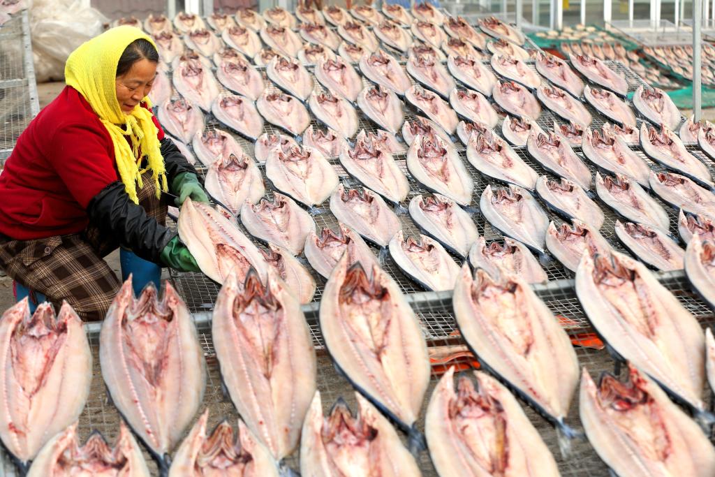 Secan pescado en distrito de Jimo de Qingdao en Shandong