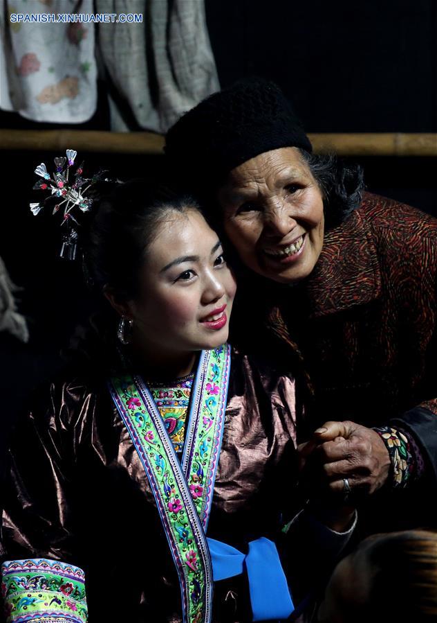 LIUZHOU, 16 feb (Xinhua) -- La novia Liang Yayu (izquierda) posó para una foto con su abuela antes de abandonar su casa en el pueblo Gandong, en el distrito autónomo de la etnia Miao de Rongshui, en la región autónoma de la etnia Zhuang de Guangxi en el sur de China el 15 de febrero. (Xinhua/Long Tao)