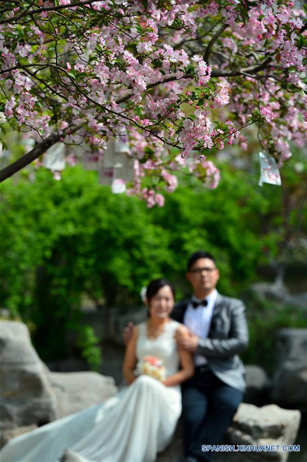 JINAN,30 mar (Xinhua) -- Una pareja posa para sus fotografías de boda cerca de flores de manzano silvestre, en el parque Wulongtan de Jinan, en la provincia de Shandong, en el este de China, el 30 de marzo de 2016. Las flores de manzano silvestre en el parque Wulongtan de Jinan han entrado en la etapa de florecimiento. (Xinhua/Guo Xulei)