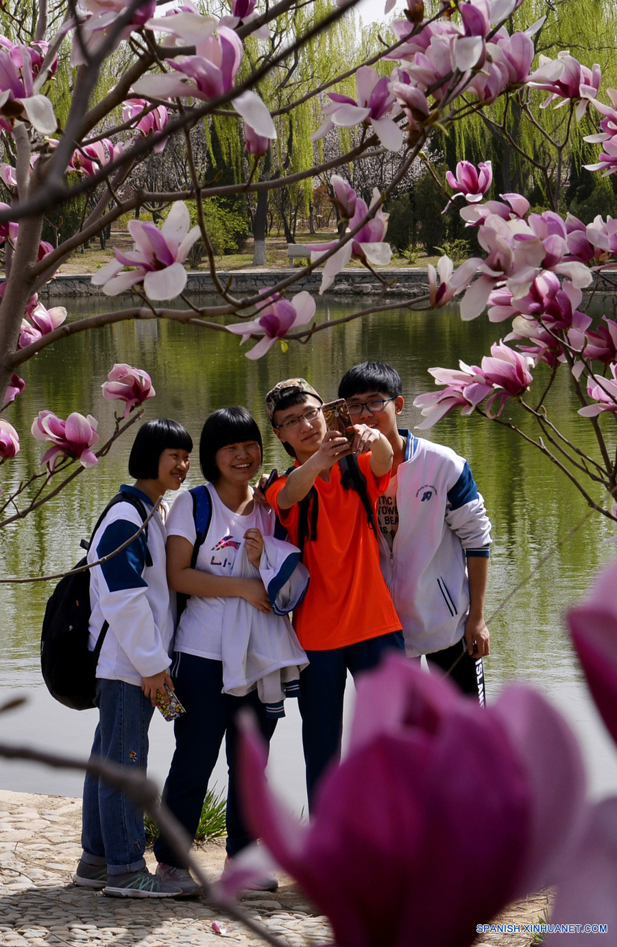 Jóvenes posan en un jardín botánico de Shijiazhuang, capital de la provincia de Hebei, en el norte de China, el 2 de abril de 2016. La belleza de la naturaleza del jardín botánico atrajo a muchas personas el primer día del Festival Qingming que tendrá una duración de tres días. (Xinhua/Wang Xiao)