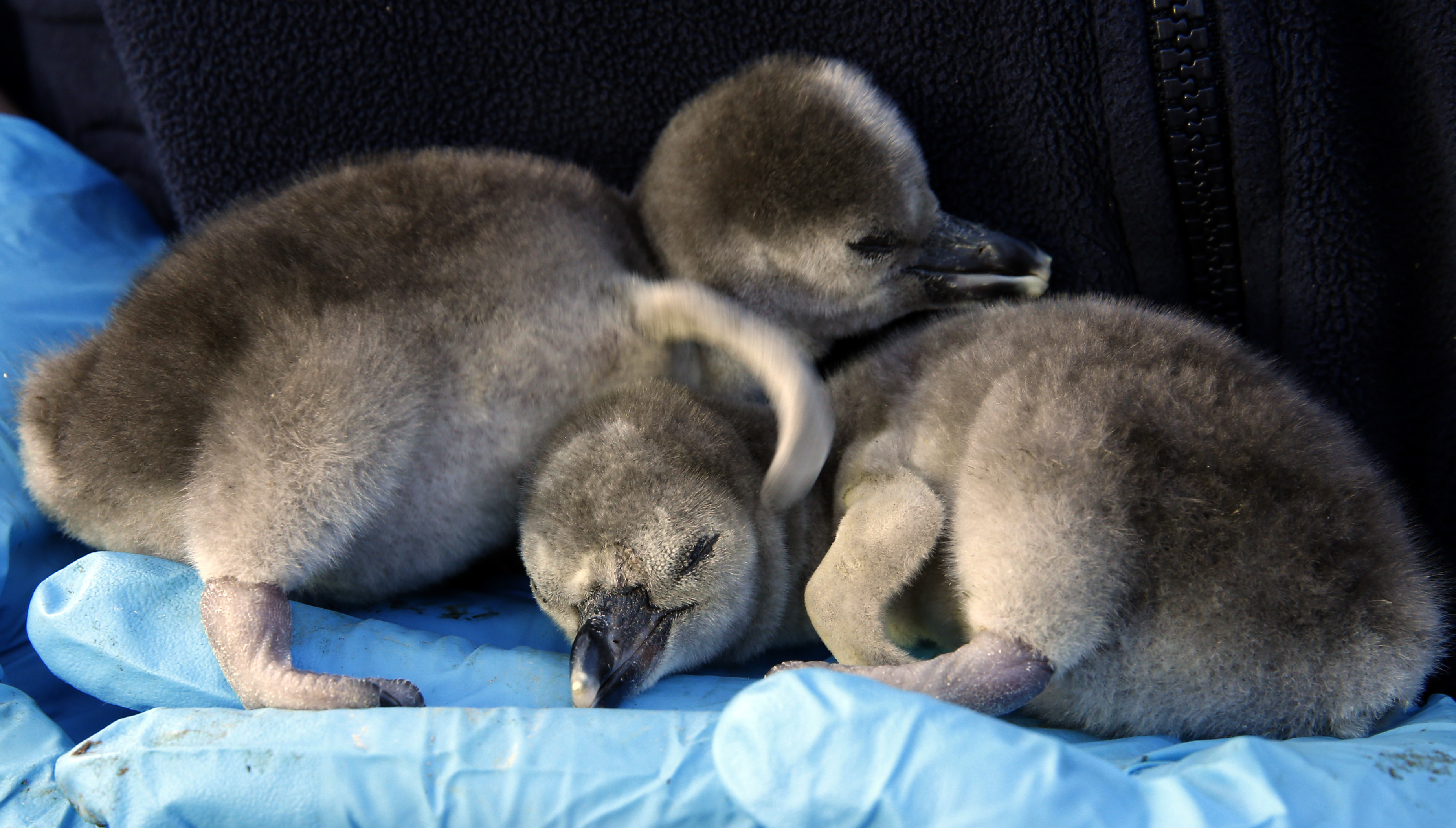 CHESTER, abril 5, 2016 (Xinhua) -- Dos polluelos de pingüino de Humboldt de dos días de nacidos fueron presentados en el Zoológico de Chester, en Chester, Reino Unido, el 5 de abril. Empleados del zoológico presentaron el martes a polluelos de pingüino de Humboldt que fueron nombrados como las marcas de frituras favoritas de sus cuidadores, de acuerdo con información de la prensa local. (Xinhua/Peter Byrne/Pa Wire/ZUMAPRESS)