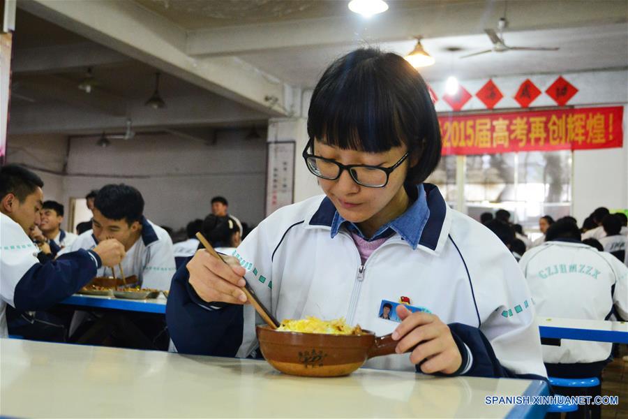 GUIZHOU, mayo 24, 2016 (Xinhua) -- Imagen del 23 de mayo de 2016 de la estudiante Yang Nan cenando en el comedor de la secundaria Minzu en el condado de Jianhe, provincia de Guizhou, en el suroeste de China. Cada año millones de estudiantes de secundaria hacen su examen de admisión a principios de junio para entrar al colegio, el tiempo previo a la aplicación del examen es muy difícil para ellos y sus padres, quienes mantienen altas esperanzas en sus hijos. Yang Nan, una chica de 18 años de la villa Tangbian del condado de Jianhe, en Guizhou, es una estudiante de último grado de secundaria que presentará su examen de admisión el próximo mes. Ella espera estudiar psicología en la Universidad de Zhejiang. La joven está bastante segura pues ha obtenido buenas notas en sus exámenes mensuales. A medida que el examen de admisión se acerca, como otros estudiantes, Yang se despierta a las 6 a.m., desayuna y después se prepara para sus exámenes en la mañana. Después de tomar una siesta de una hora al mediodía, ella estudia por sí misma en el salón de clases hasta la noche. Ella siempre se acuesta a dormir a las 12 p.m. (Xinhua/Yang Wenbin)