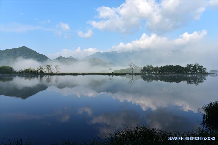 HUBEI, julio 17, 2016 (Xinhua) -- Imagen del 13 de julio de 2015 de un paisaje del humedal del lago Dajiu, en el Distrito Forestal Shennongjia, en la provincia central de Hubei, en China. El domingo durante la 40 sesión del Comité del Patrimonio Mundial se decidió incluir a Shennongjia, de la provincia china de Hubei, en la Lista del Patrimonio Mundial de la Humanidad como sitio natural, lo que eleva a 50 el número de sitios chinos incluidos en la lista. Localizado en las montañas del noroeste de la provincia de Hubei, el Distrito Forestal Shennongjia fue establecido en 1970. Shennongjia es el único ecosistema de bosque sub-tropical bien preservado en las latitudes medias del mundo y se aprecia de tener más de 5,000 especies de animales y plantas. (Xinhua/Du Huaju)