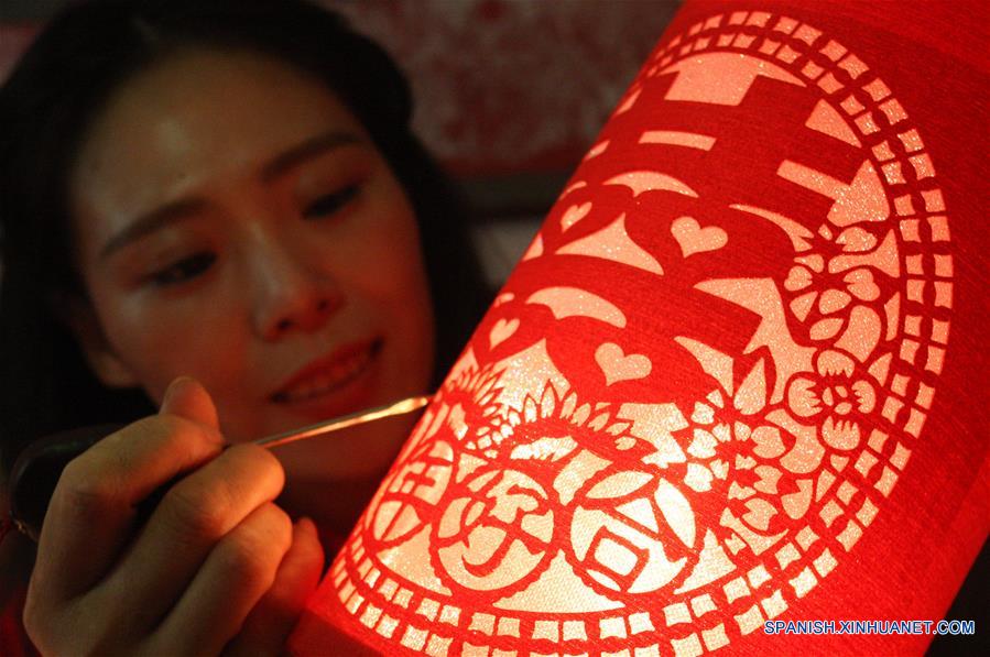 SHANDONG, agosto 4, 2016 (Xinhua) -- Imagen del 3 de agosto de 2016 de Liang Qiaoyan, una artista popular del papel recortado, trabajando en una obra de papel recortado para una ceremonia de boda en su estudio en Yantai, provincia de Shandong, en el este de China. Liang ha elaborado más de 40 tipos de manualidades de papel recortado ya que combina el corte con la porcelana, paño, etc. (Xinhua/Shen Jizhong)
