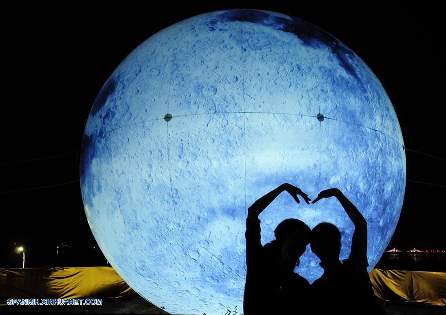 JIUJIANG, septiembre 13, 2016 (Xinhua) -- Imagen del 10 de septiembre de 2016 de personas posando frente a una luna artificial en la ciudad de Jiujiang, en la provincia de Jiangxi, en el este de China. La luna artificial con un diámetro de 6 metros fue erigida para recibir el tradicional Festival de Medio Otoño, que cae el 15 de septiembre este año. (Xinhua/Hu Guolin)