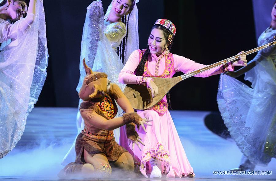 URUMQI, septiembre 21, 2016 (Xinhua) -- Artistas realizan una presentación sobre el Muqam, un arte tradicional de Uygur que combina canciones, bailes y musica clásica y folclórica, durante la ceremonia de apertura de la Semana de la Cultura China y Extranjera en Urumqi, capital de la Región Autónoma Uygur de Xinjiang, en el noroeste de China, el 20 de septiembre de 2016. La semana de la cultura comenzó el martes como parte de la V Exposición China-Eurasia. (Xinhua/Wang Fei)