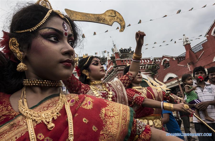 CALCUTA, septiembre 21, 2016 (Xinhua) -- Niñas indias vestidas como la diosa "Durga" posa en un mercado previo al festival Durga Puja, en Calcuta, capital del Estado de Bengala Occidental, en India, el 20 de septiembre de 2016. El Festival Durga Puja es uno de los mayores festivales hindúes que involucran la adoración de la diosa Durga, que simboliza el poder y el triunfo del bien sobre el mal en la mitología hindú. (Xinhua/Tumpa Mondal)