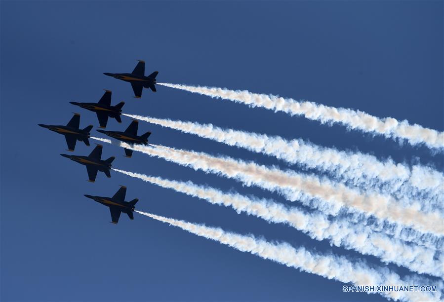 BALTIMORE, octubre 15, 2016 (Xinhua) -- Aviones del escuadrón Blue Angels de la Armada de Estados Unidos de América, vuelan sobre el Fuerte McHenry durante la primera Semana de la Armada y Espectáculo Aéreo de Maryland, en Baltimore, en el estado de Maryland, Estados Unidos de América, el 15 de octubre de 2016. Los Blue Angels, F-22 Raptor de la Fuerza Aérea, los F-35 Lightning y los CF-18 Hornet de la Fuerza Aérea de Canadá, participaron el sábado en el espectáculo aéreo. (Xinhua/Yin Bogu)