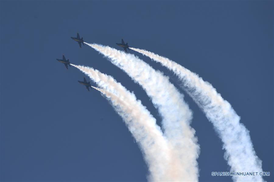 BALTIMORE, octubre 15, 2016 (Xinhua) -- Aviones del escuadrón Blue Angels de la Armada de Estados Unidos de América, vuelan sobre el Fuerte McHenry durante la primera Semana de la Armada y Espectáculo Aéreo de Maryland, en Baltimore, en el estado de Maryland, Estados Unidos de América, el 15 de octubre de 2016. Los Blue Angels, F-22 Raptor de la Fuerza Aérea, los F-35 Lightning y los CF-18 Hornet de la Fuerza Aérea de Canadá, participaron el sábado en el espectáculo aéreo. (Xinhua/Yin Bogu)
