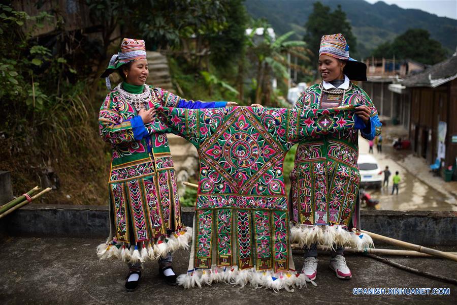 GUIZHOU, octubre 30, 2016 (Xinhua) -- Pobladoras del grupo étnico Miao muestran la prenda tradicional de cien aves con bordado, en la aldea Gaopai del condado de Rongjiang, en la provincia de Guizhou, en el suroeste de China, el 30 de octubre de 2016. La vestimenta de cien aves, bordada con seda de colores y plumas de aves, es la prenda tradicional para los festivales y ocasiones importantes para el grupo étnico Miao. (Xinhua/Liu Xu)