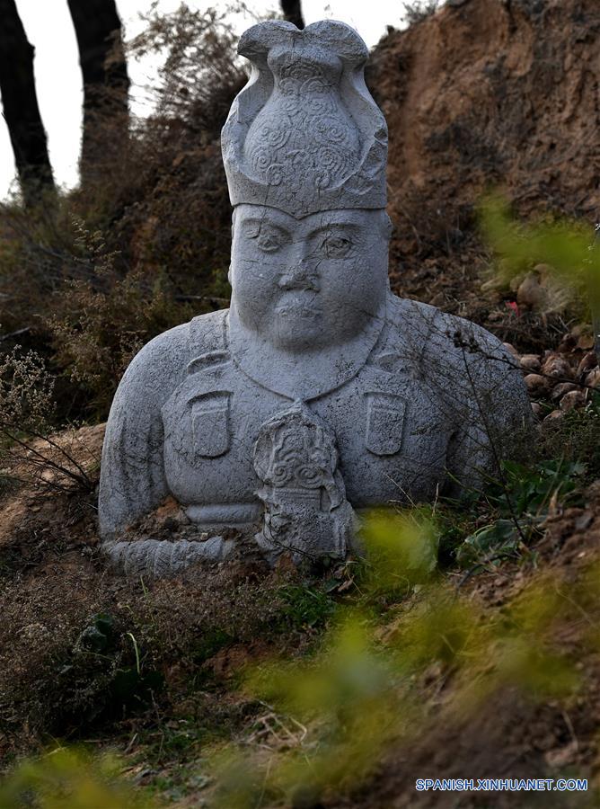 SHAANXI, noviembre 28, 2016 (Xinhua) -- Vista de una escultura de piedra en el Mausoleo de Jianling, la tumba del Emperador Suzong de la Dinastía Tang (618-907), en el condado de Liquan, en la provincia de Shaanxi, en el noroeste de China, el 27 de noviembre de 2016. Las antiguas esculturas de la tumba ocupan una importante posición en la historia del arte chino, su distintivo estilo plasma directamente la cultura tradicional de China, especialmente durante la Dinastía Tang. (Xinhua/Tao Ming)