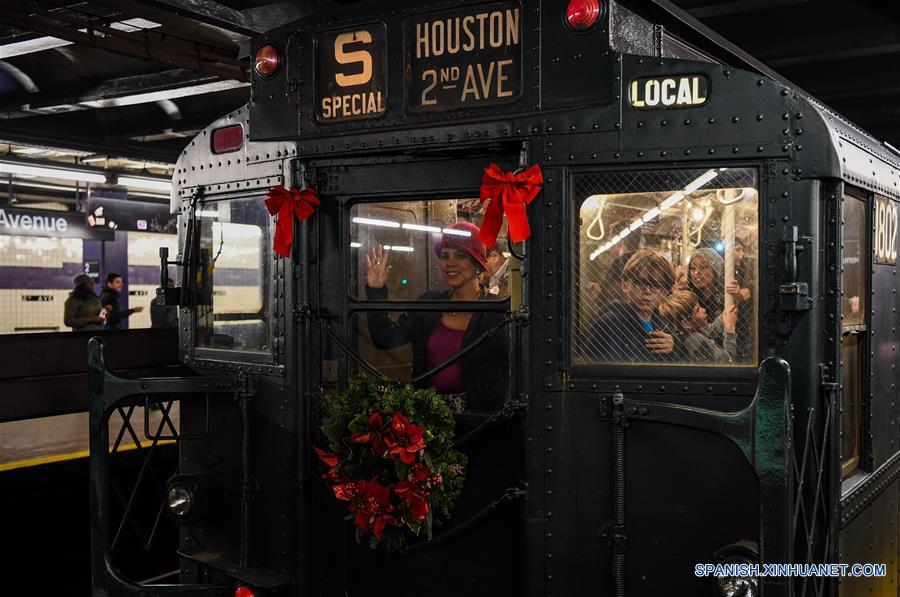 NUEVA YORK, diciembre 19, 2016 (Xinhua) -- Imagen del 18 de diciembre de 2016, de personas viajando en el "Tren Especial de Compradores de la Nostalgia" en la ciudad de Nueva York, Estados Unidos de América. De acuerdo con información de la prensa local, el "Tren Especial de Compradores de la Nostalgia" es un tren del metro de Nueva York con 8 vagones que datan de 1932 a 1977. El tren especial lleva a los compradores de Bajo Manhattan a Queens, y funciona por cuatro domingos, desde el fin de semana de Acción de Gracias hasta el domingo de una semana antes de Navidad. (Xinhua/Li Rui)