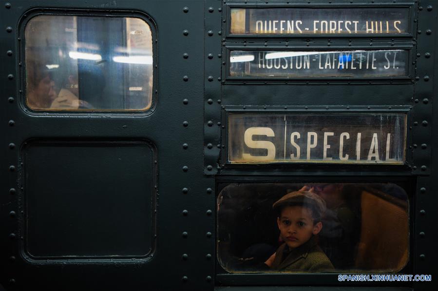 NUEVA YORK, diciembre 19, 2016 (Xinhua) -- Imagen del 18 de diciembre de 2016, de un niño con ropa antigua mirando por una ventana del "Tren Especial de Compradores de la Nostalgia" en la ciudad de Nueva York, Estados Unidos de América. De acuerdo con información de la prensa local, el "Tren Especial de Compradores de la Nostalgia" es un tren del metro de Nueva York con 8 vagones que datan de 1932 a 1977. El tren especial lleva a los compradores de Bajo Manhattan a Queens, y funciona por cuatro domingos, desde el fin de semana de Acción de Gracias hasta el domingo de una semana antes de Navidad. (Xinhua/Li Rui)