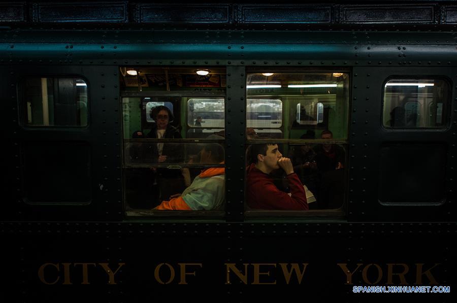 NUEVA YORK, diciembre 19, 2016 (Xinhua) -- Imagen del 18 de diciembre de 2016, de personas con ropa antigua viajando en el "Tren Especial de Compradores de la Nostalgia" en la ciudad de Nueva York, Estados Unidos de América. De acuerdo con información de la prensa local, el "Tren Especial de Compradores de la Nostalgia" es un tren del metro de Nueva York con 8 vagones que datan de 1932 a 1977. El tren especial lleva a los compradores de Bajo Manhattan a Queens, y funciona por cuatro domingos, desde el fin de semana de Acción de Gracias hasta el domingo de una semana antes de Navidad. (Xinhua/Li Rui)