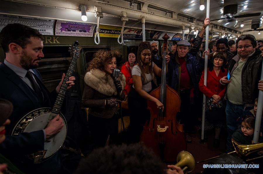 NUEVA YORK, diciembre 19, 2016 (Xinhua) -- Imagen del 18 de diciembre de 2016, de artistas con ropa antigua tocando en el "Tren Especial de Compradores de la Nostalgia" en la ciudad de Nueva York, Estados Unidos de América. De acuerdo con información de la prensa local, el "Tren Especial de Compradores de la Nostalgia" es un tren del metro de Nueva York con 8 vagones que datan de 1932 a 1977. El tren especial lleva a los compradores de Bajo Manhattan a Queens, y funciona por cuatro domingos, desde el fin de semana de Acción de Gracias hasta el domingo de una semana antes de Navidad. (Xinhua/Li Rui)