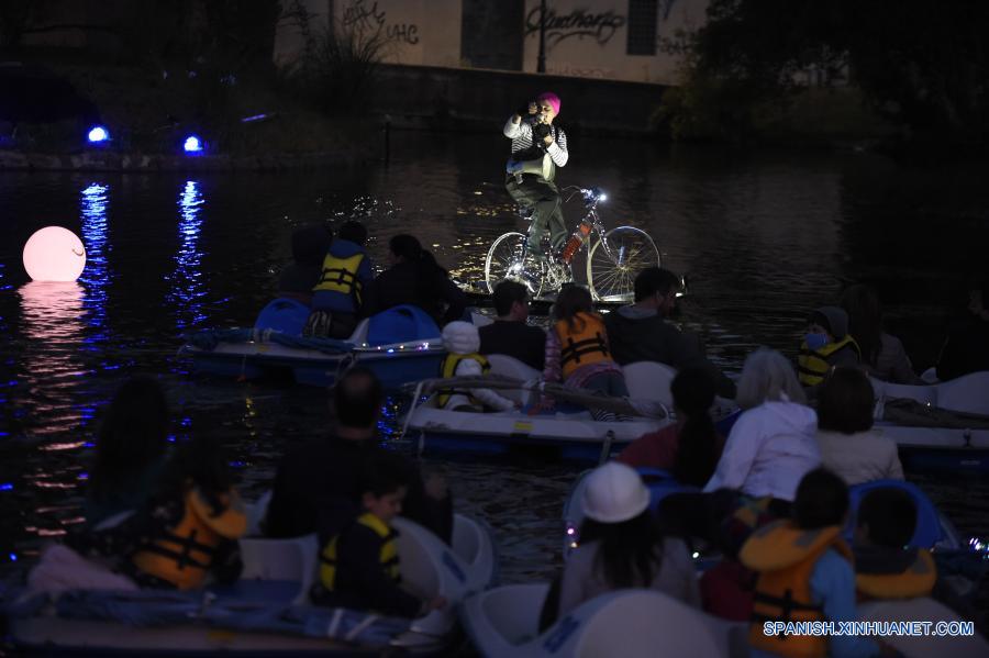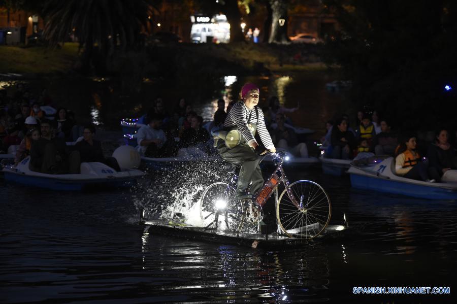 MONTEVIDEO, 20 noviembre, 2020 (Xinhua) -- Un artista a bordo de un bote con tracción de bicicleta se presenta durante la función de teatro negro "Kodama" sobre las aguas del lago del Parque Rodó, en Montevideo, capital de Uruguay, el 20 de noviembre de 2020. La Compañía Romanelli presentó sobre las aguas del lago del Parque Rodó la obra de teatro negro "Kodama", en donde el público acompaña los cuatro actos pedaleando a bordo de botes, y que se presentará todos los viernes y sábados de noviembre y diciembre. (Xinhua/Nicolás Celaya)