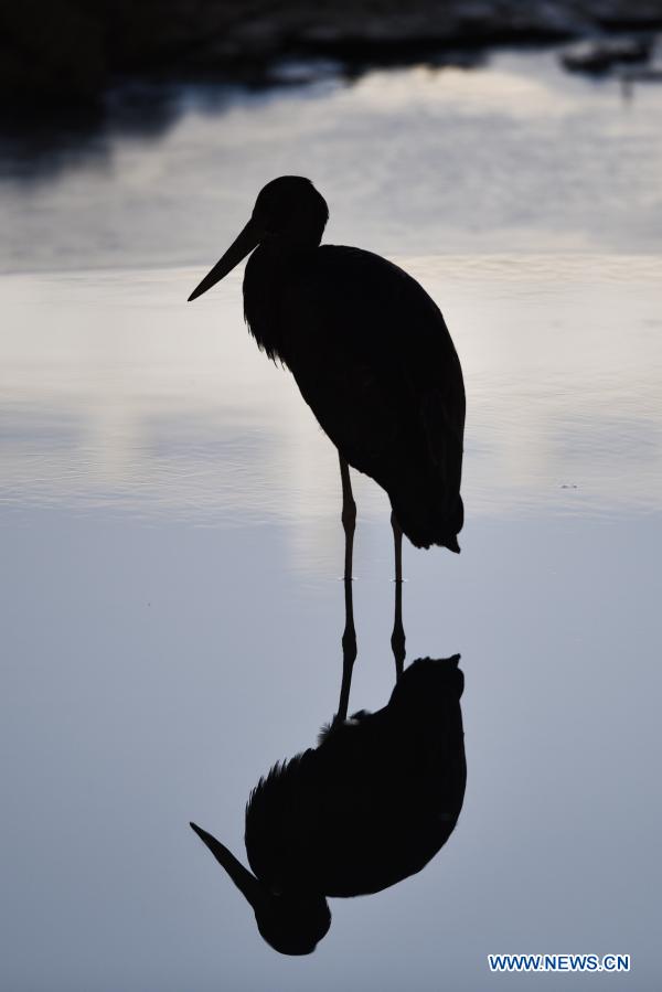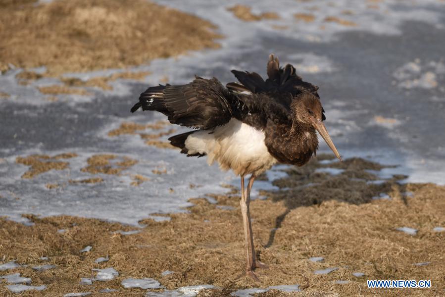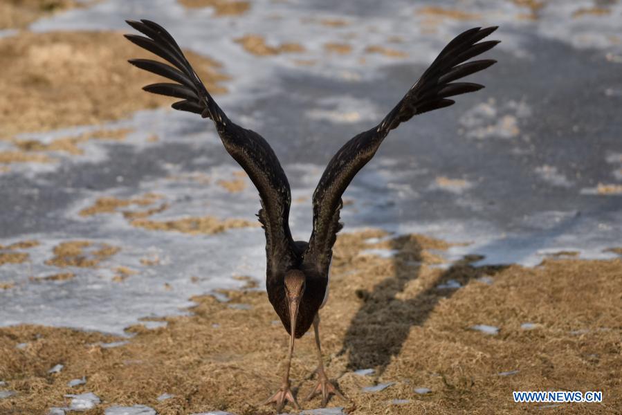 XINING, 6 diciembre, 2020 (Xinhua) -- Imagen del 6 de diciembre de 2020 de una cigüeña negra en el parque de humedales del río Beichuan, en la ciudad de Xining, provincia de Qinghai, en el noroeste de China. Recientemente, en el parque de humedales se encontraron dos cigüeñas negras, una especie de ave migratoria bajo protección de primera clase en China. En la actualidad solamente hay alrededor de 3.000 cigüeñas negras en todo el mundo. (Xinhua/Wu Gang)