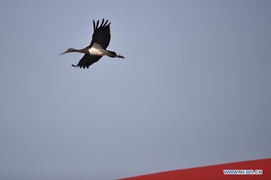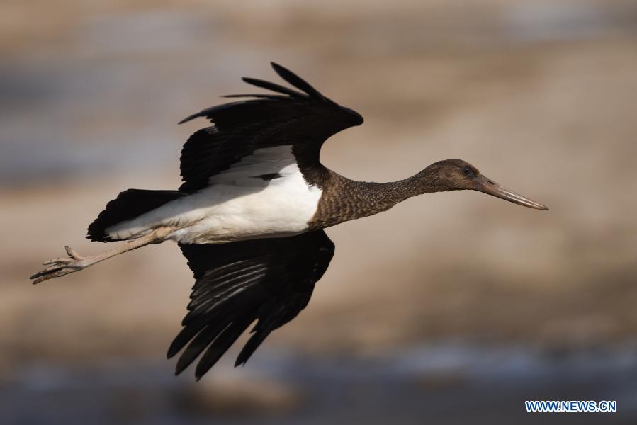 XINING, 6 diciembre, 2020 (Xinhua) -- Una cigüeña negra vuela en el parque de humedales del río Beichuan, en la ciudad de Xining, provincia de Qinghai, en el noroeste de China, el 6 de diciembre de 2020. Recientemente, en el parque de humedales se encontraron dos cigüeñas negras, una especie de ave migratoria bajo protección de primera clase en China. En la actualidad solamente hay alrededor de 3.000 cigüeñas negras en todo el mundo. (Xinhua/Wu Gang)
