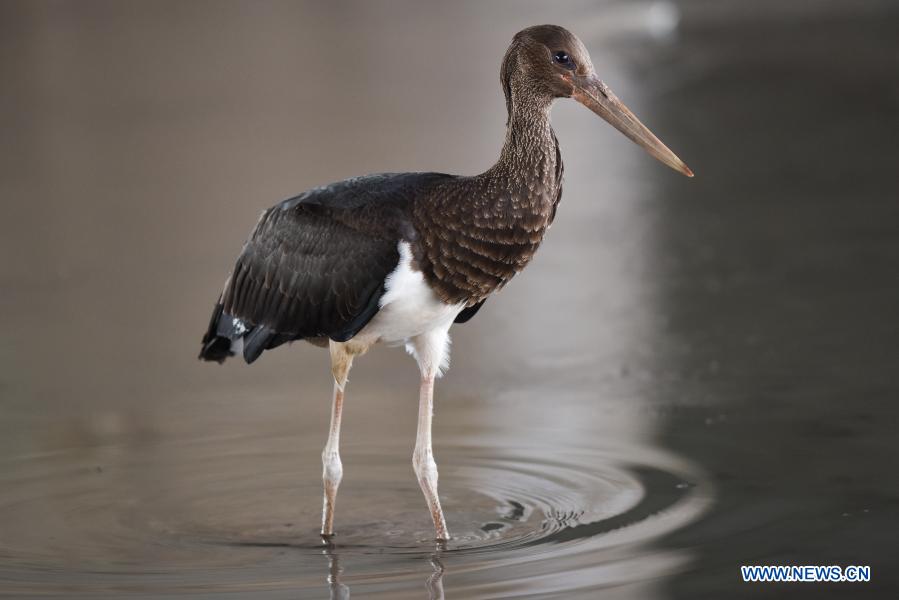 XINING, 6 diciembre, 2020 (Xinhua) -- Una cigüeña negra se alimenta en el parque de humedales del río Beichuan, en la ciudad de Xining, provincia de Qinghai, en el noroeste de China, el 6 de diciembre de 2020. Recientemente, en el parque de humedales se encontraron dos cigüeñas negras, una especie de ave migratoria bajo protección de primera clase en China. En la actualidad solamente hay alrededor de 3.000 cigüeñas negras en todo el mundo. (Xinhua/Wu Gang)