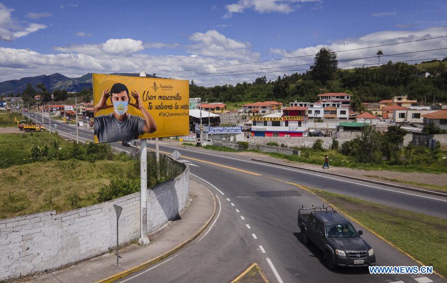 QUITO, 7 diciembre, 2020 (Xinhua) -- Imagen tomada con un dron de un vehículo circulando por una calle en Quito, capital de Ecuador, el 7 de diciembre de 2020. (Xinhua/Santiago Armas)