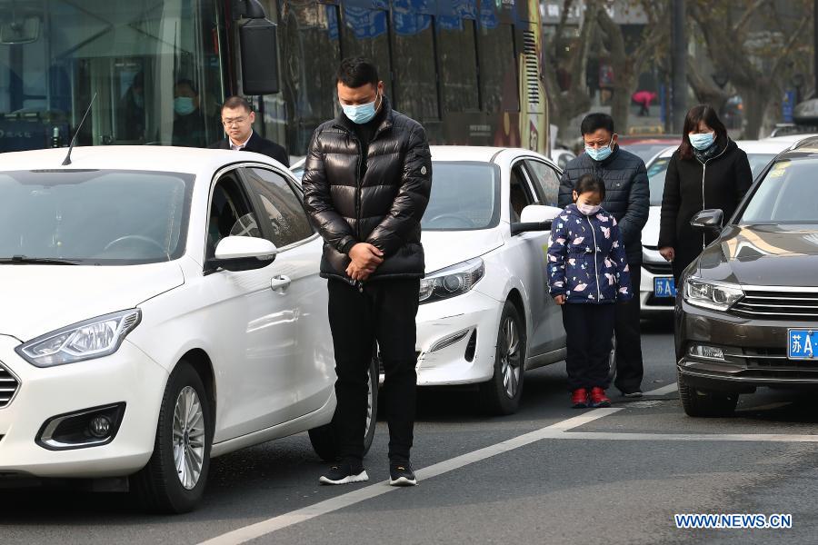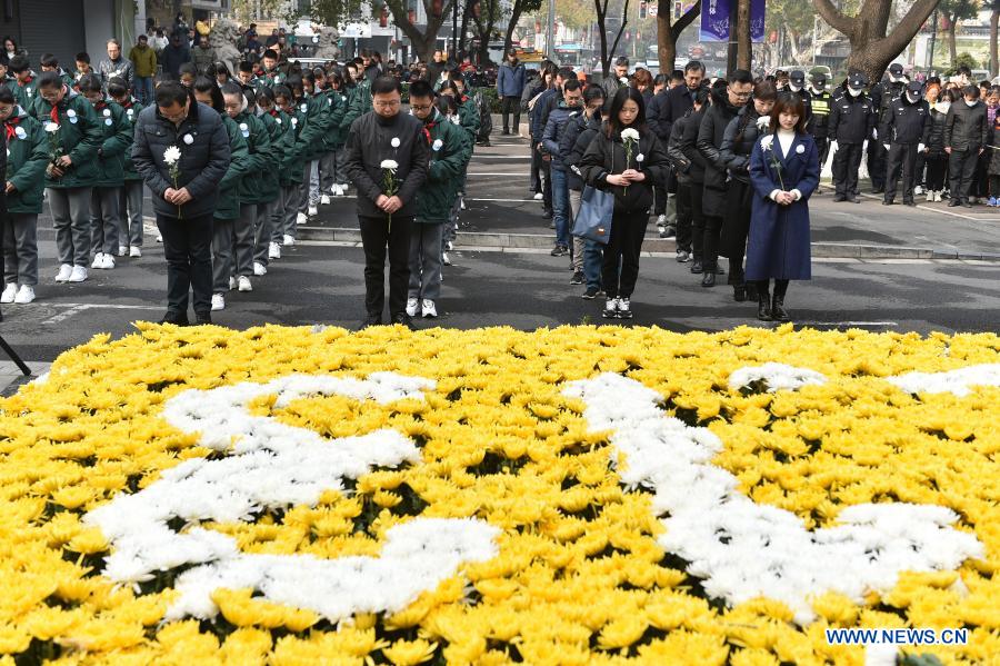 NANJING, 13 diciembre, 2020 (Xinhua) -- Personas participan en un momento de silencio en conmemoración de las víctimas de la Masacre de Nanjing con motivo del séptimo día conmemorativo nacional, en Nanjing, capital de la provincia de Jiangsu, en el este de China, el 13 de diciembre de 2020. (Xinhua/Xin Yi)