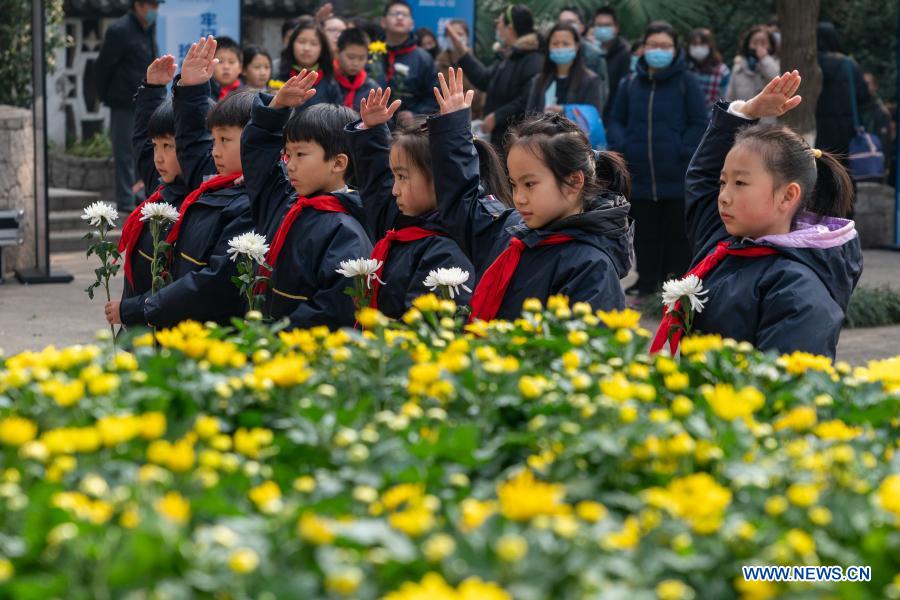 NANJING, 13 diciembre, 2020 (Xinhua) -- Integrantes de los Jóvenes Pioneros Chinos saludan frente a un monumento en conmemoración de las víctimas de la Masacre de Nanjing en un lugar de entierro masivo con motivo del séptimo día conmemorativo nacional, en Nanjing, capital de la provincia de Jiangsu, en el este de China, el 13 de diciembre de 2020. (Xinhua/Du Yi)