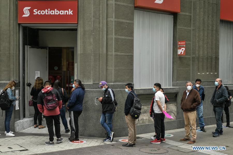 SANTIAGO, 18 diciembre, 2020 (Xinhua) -- Personas se forman para ingresar a una sucursal bancaria, en Santiago, capital de Chile, el 18 de diciembre de 2020. (Xinhua/Jorge Villegas)