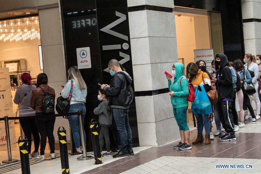 SANTIAGO, 18 diciembre, 2020 (Xinhua) -- Personas se forman para ingresar a un centro comercial, en Santiago, capital de Chile, el 18 de diciembre de 2020. (Xinhua/Jorge Villegas)
