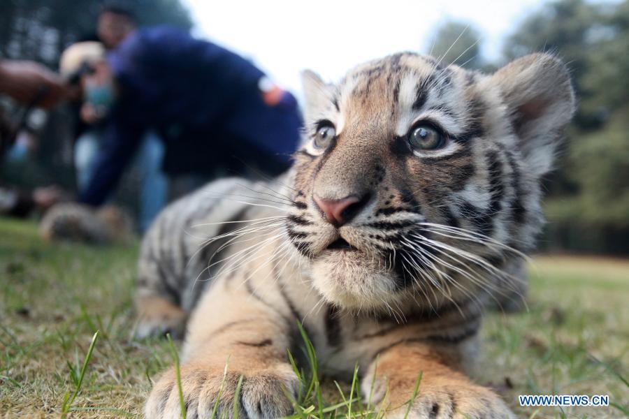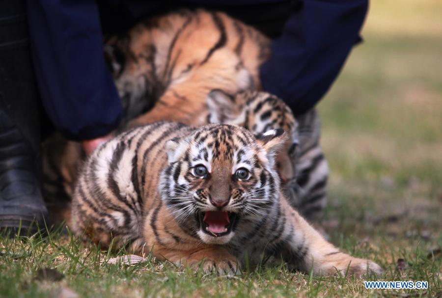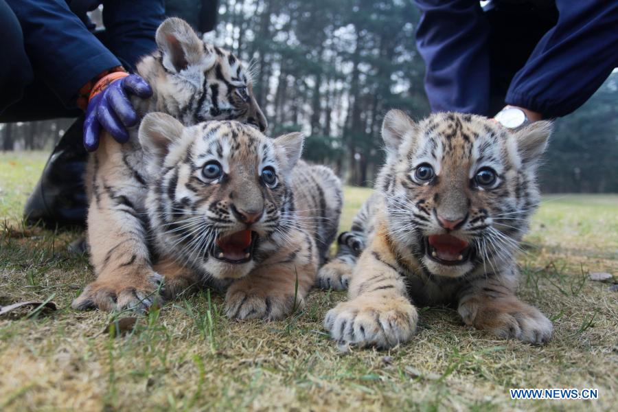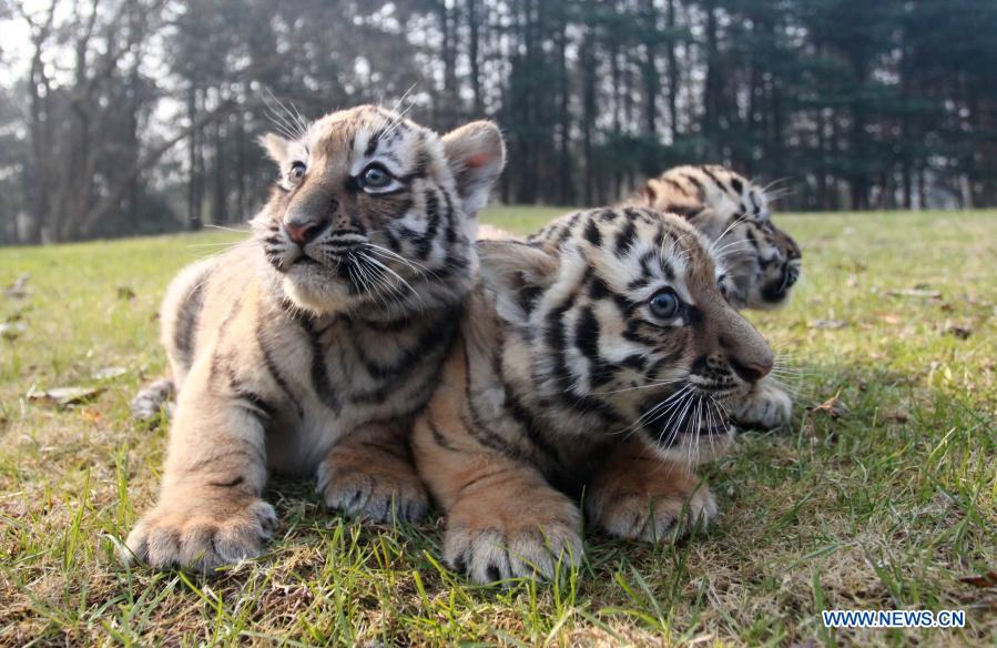 YANGZHOU, 24 diciembre, 2020 (Xinhua) -- Tres cachorros de tigre juegan en el Zoológico de Yangzhou, en Yangzhou, en la provincia de Jiangsu, en el este de China, el 24 de diciembre de 2020. Los trillizos de tigre del Zoológico de Yangzhou hicieron su debut el jueves. Los trillizos, dos hembras y un macho, nacieron el 24 de octubre este año. (Xinhua/Meng Delong)