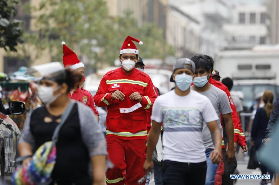 LIMA, 22 diciembre, 2020 (Xinhua) -- Bomberos portan gorros de Santa Claus mientras caminan por la zona comercial de Mesa Redonda, en Lima, Perú, el 22 de diciembre de 2020. (Xinhua/Mariana Bazo)