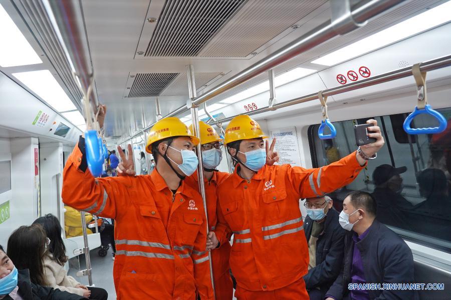NANCHANG, 26 diciembre, 2020 (Xinhua) -- Trabajadores se toman una fotografía en un tren de la Línea 3 del Metro de Nanchang, en la ciudad de Nanchang, capital de la provincia de Jiangxi, en el este de China, el 26 de diciembre de 2020. La Línea 3 del Metro de Nanchang de 28.5 kilómetros de longitud fue puesta en funcionamiento inicial el sábado. (Xinhua/Wan Xiang)