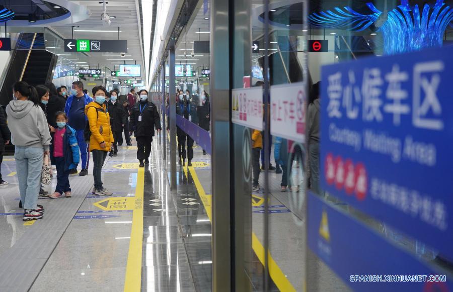 NANCHANG, 26 diciembre, 2020 (Xinhua) -- Ciudadanos esperan un tren en la estación Camino Qingshan de la Línea 3 del Metro de Nanchang, en la ciudad de Nanchang, capital de la provincia de Jiangxi, en el este de China, el 26 de diciembre de 2020. La Línea 3 del Metro de Nanchang de 28.5 kilómetros de longitud fue puesta en funcionamiento inicial el sábado. (Xinhua/Wan Xiang)