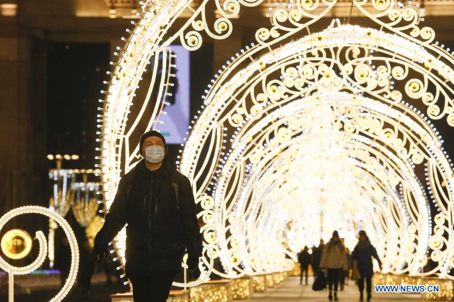 MOSCU, 29 diciembre, 2020 (Xinhua) -- Personas caminan a través de un arco iluminado para las próximas vacaciones de Año Nuevo y Navidad Ortodoxa, en Moscú, Rusia, el 29 de diciembre de 2020. (Xinhua/Alexander Zemlianichenko Jr)