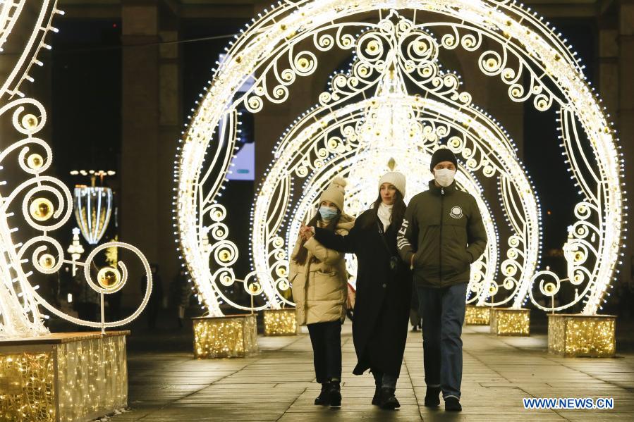 MOSCU, 29 diciembre, 2020 (Xinhua) -- Personas observan las instalaciones iluminadas para las próximas vacaciones de Año Nuevo y Navidad Ortodoxa, en Moscú, Rusia, el 29 de diciembre de 2020. (Xinhua/Alexander Zemlianichenko Jr)