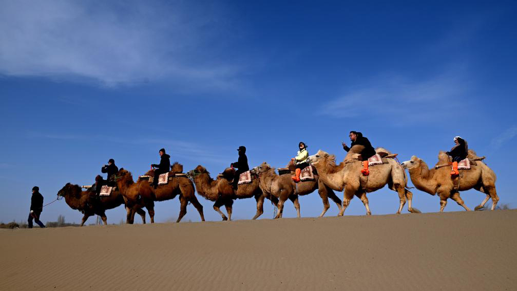 Turistas visitan el Area Escénica de la Montaña Mingsha y el Manantial de la Luna Creciente en Dunhuang, Gansu