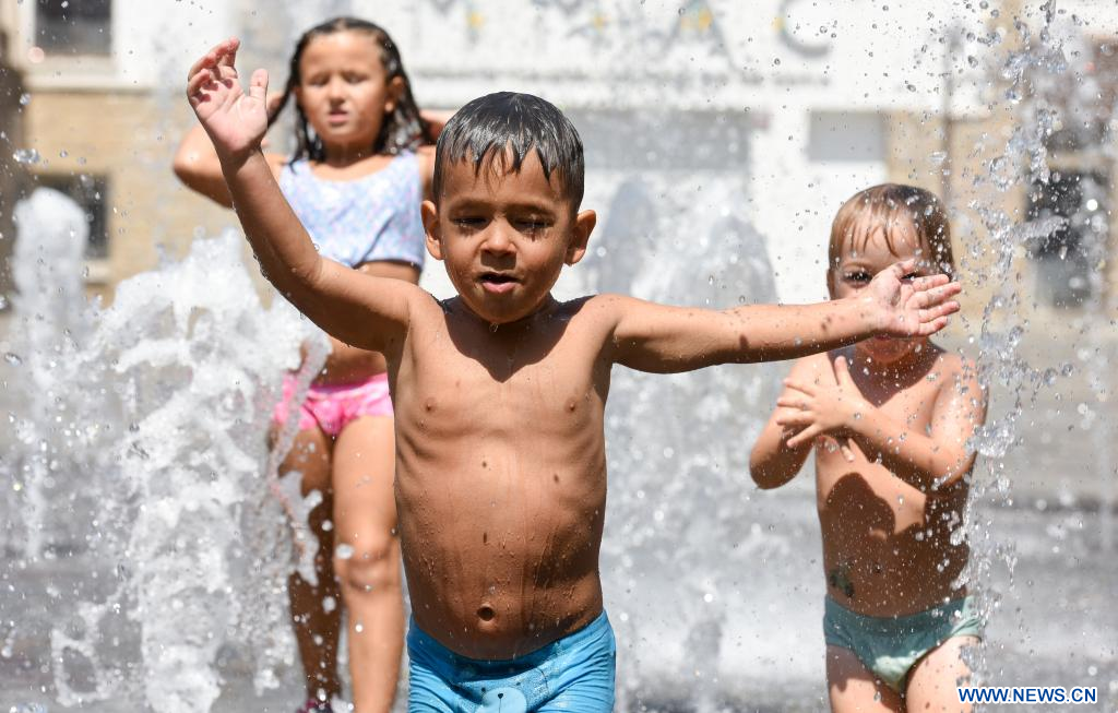 CORIA, 1 agosto, 2022 (Xinhua) -- Imagen del 30 de julio de 2022 de niños jugando en una fuente para refrescarse en Coria, España. (Xinhua/Gustavo Valiente)