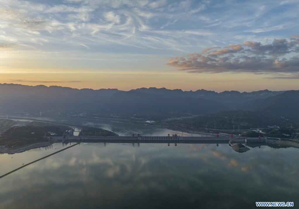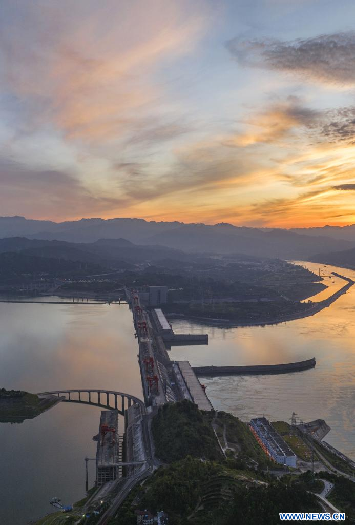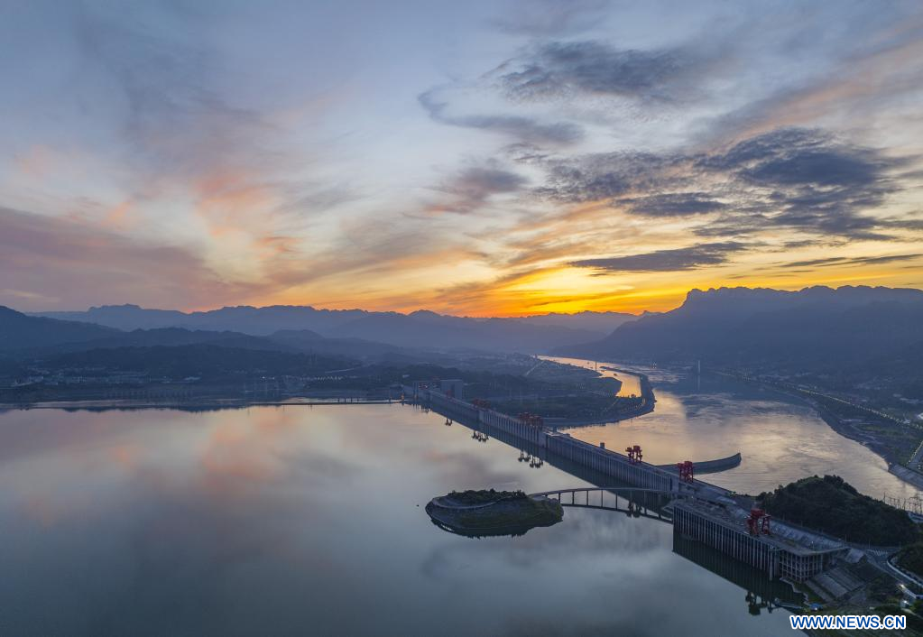 ZIGUI, 9 agosto, 2022 (Xinhua) -- Vista aérea del 9 de agosto de 2022 de la presa de Tres Gargantas al amanecer, en el distrito de Zigui de Yichang, provincia de Hubei, en el centro de China. (Xinhua/Wang Gang)