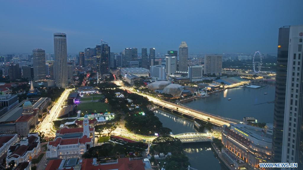 SINGAPUR, 26 septiembre, 2022 (Xinhua) -- Imagen del 26 de septiembre de 2022 del Circuito Callejero de Marina Bay de la próxima carrera nocturna del Gran Premio de Singapur de Fórmula 1 (F1), en la ciudad de Singapur, capital de Singapur. La carrera nocturna del Gran Premio de Singapur de F1 se llevará a cabo del 30 de septiembre al 2 de octubre. (Xinhua/Then Chih Wey)