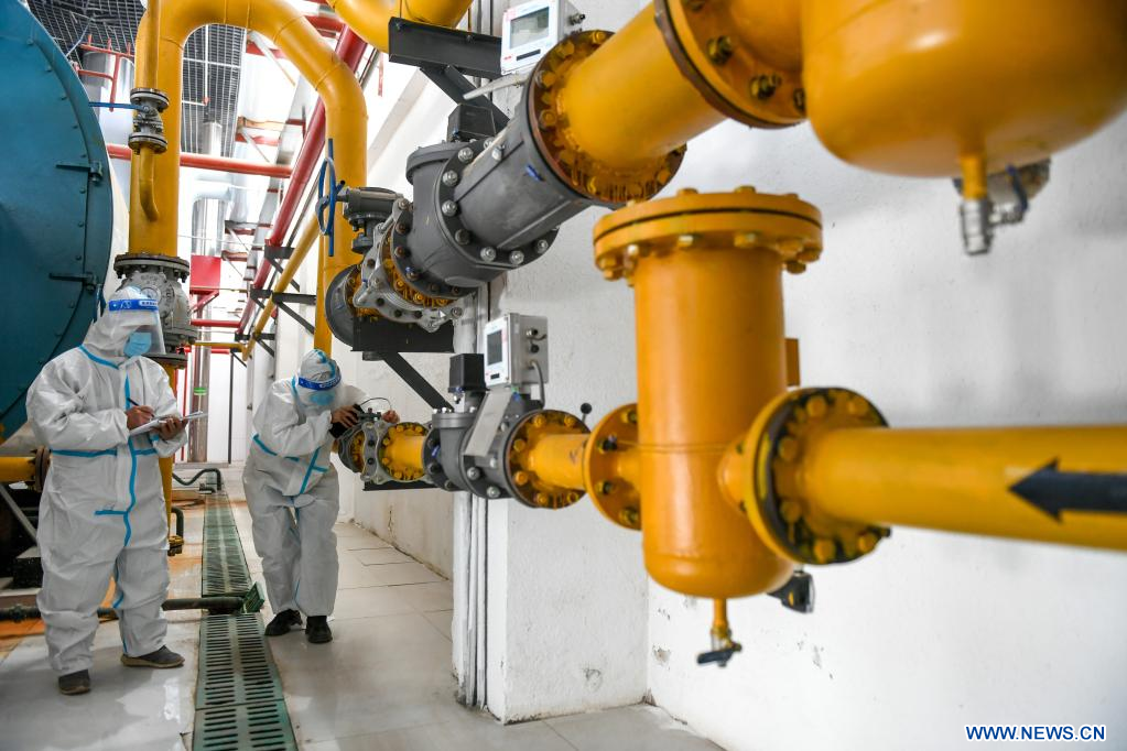 HOHHOT, 11 octubre, 2022 (Xinhua) -- Imagen del 10 de octubre de 2022 de trabajadores revisando los gasoductos en una empresa de calefacción, en Hohhot, en la región autónoma de Mongolia Interior, en el norte de China. El suministro de calefacción comienza este año con anticipación como respuesta para hacer frente a una fuerte caída de la temperatura en Hohhot. (Xinhua/Bei He)